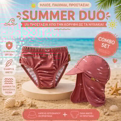 Αυτό το ολοκληρωμένο καλοκαιρινό πακέτο συνδυάζει αντηλιακή προστασία, άνεση και ασφάλεια στο νερό — για ξέγνοιαστες στιγμές σε παραλία και πισίνα.