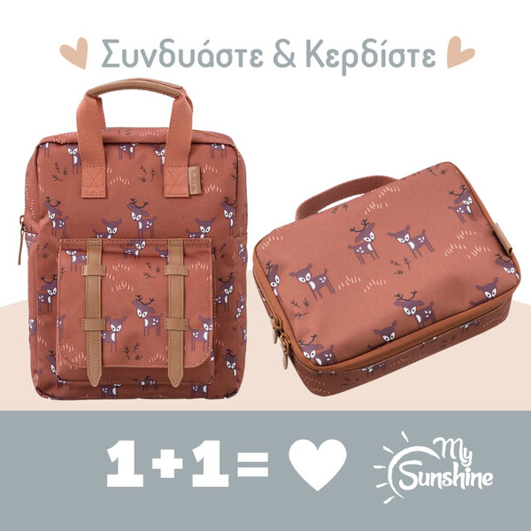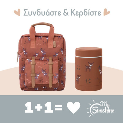 - Έχει ειδικό τμήμα εσωτερικά έτσι ώστε να τοποθετεί το ποτηράκι του, ή το παγούρι του και να μένει στη θέση του