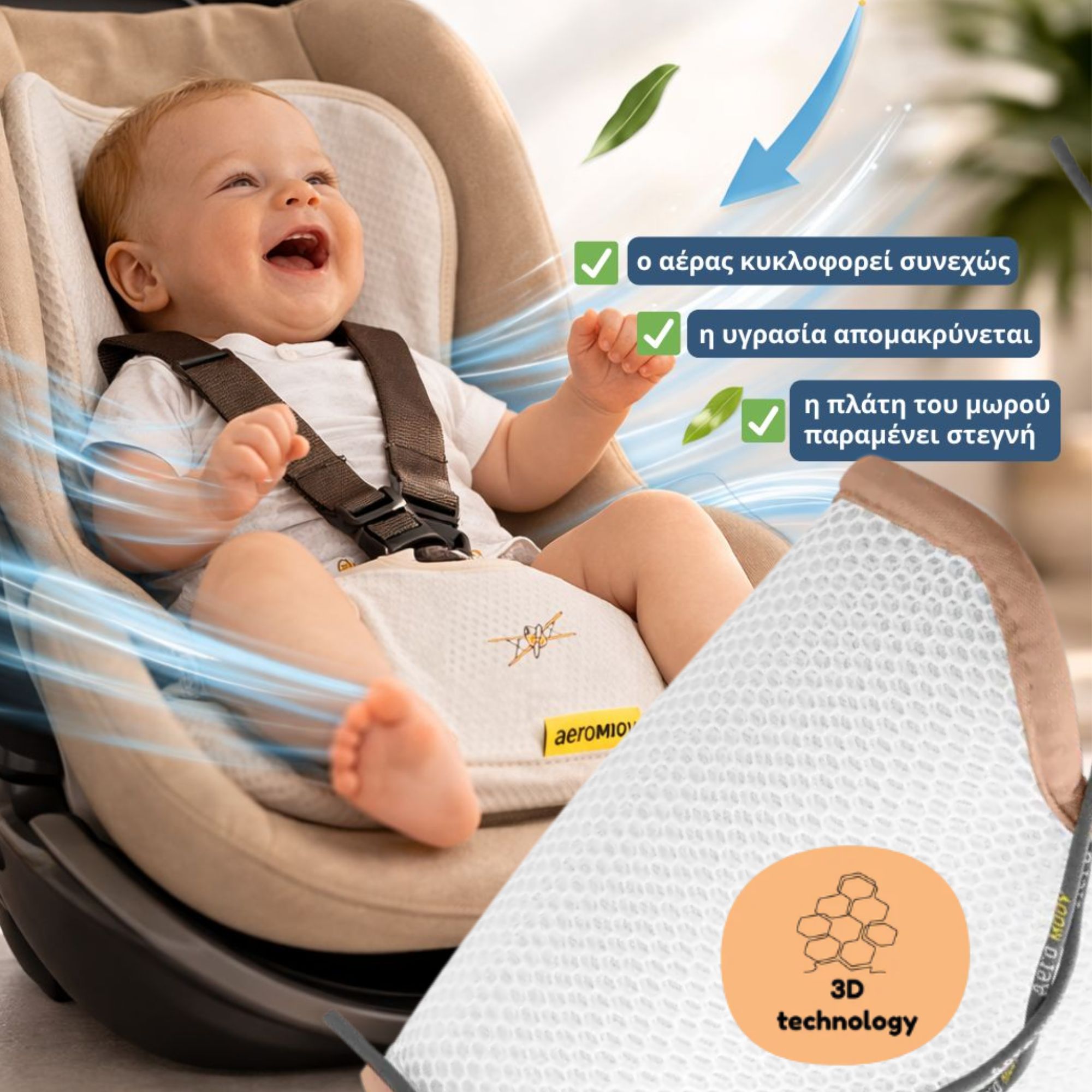 Η μοναδική 3D δομή αερισμού δημιουργεί ένα στρώμα αέρα ανάμεσα στο μωρό και το κάθισμα.