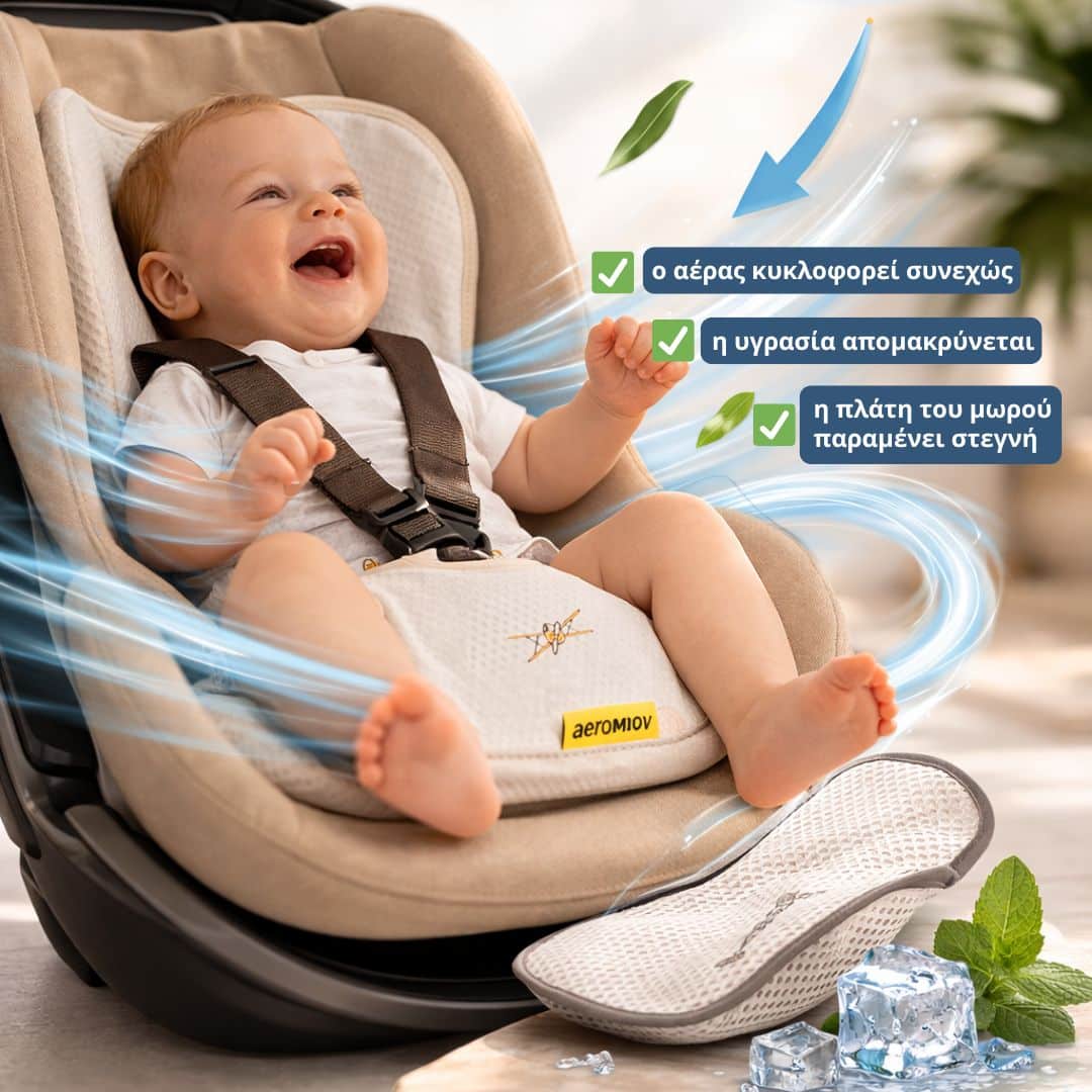 Η μοναδική 3D δομή αερισμού δημιουργεί ένα στρώμα αέρα ανάμεσα στο μωρό και το κάθισμα.