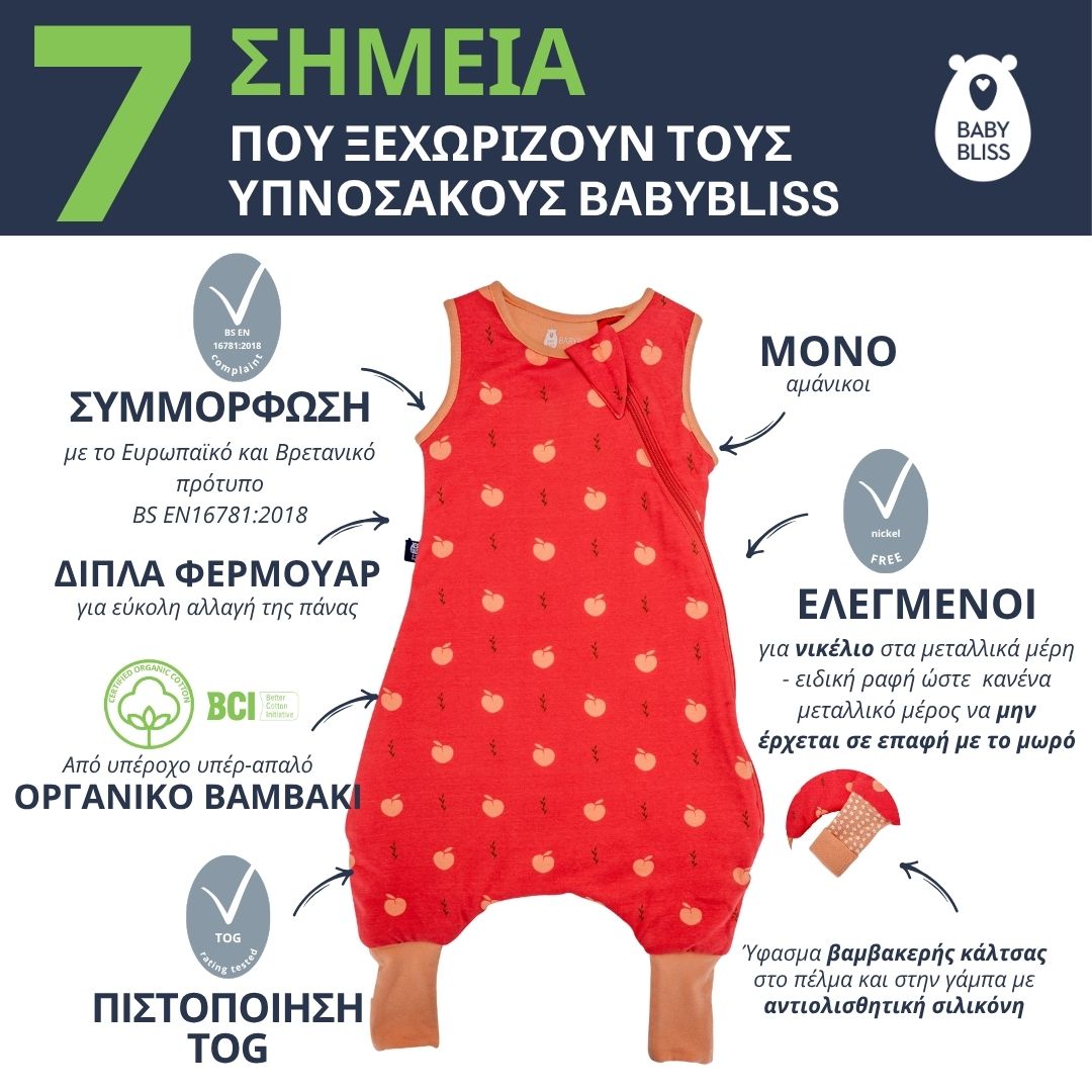 Από τη συσκευασία μέχρι και κάθε λεπτομέρεια, οι υπνόσακοι BabyBliss είναι φτιαγμένοι με συνείδηση για το περιβάλλον. Η συσκευασία ακολουθεί τη φιλοσοφία του "δεν πετάω τίποτα":