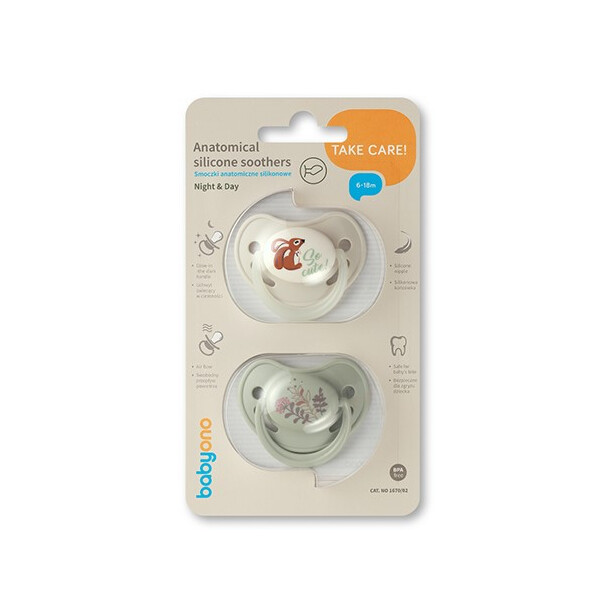 Η ανατομική πιπίλα σιλικόνης Babyono βοηθά το μωρό σου να χαλαρώσει και σου προσφέρει μερικές πολύτιμες στιγμές ηρεμίας. Χάρη στη σχεδίαση με κυρτή άνω πλευρά και επίπεδη κάτω πλευρά, προσαρμόζεται στο στόμα του παιδιού, υποστηρίζοντας τη σωστή ανάπτυξη του ουρανίσκου και της γνάθου.