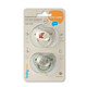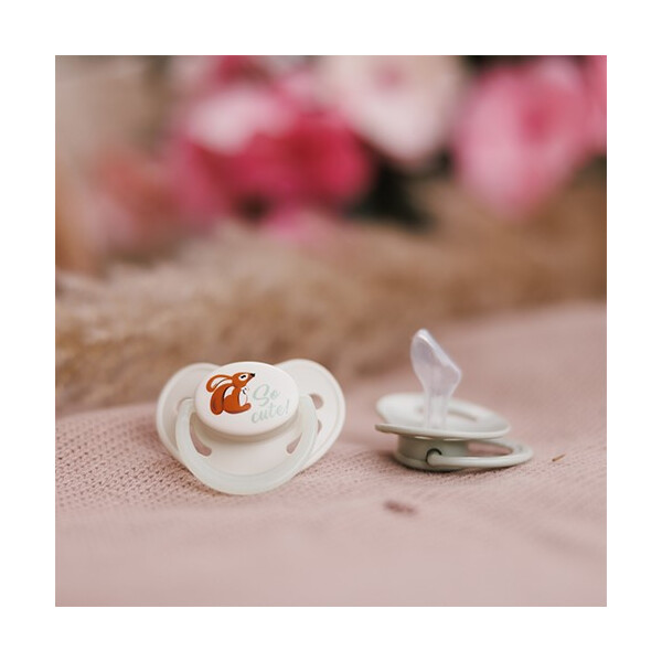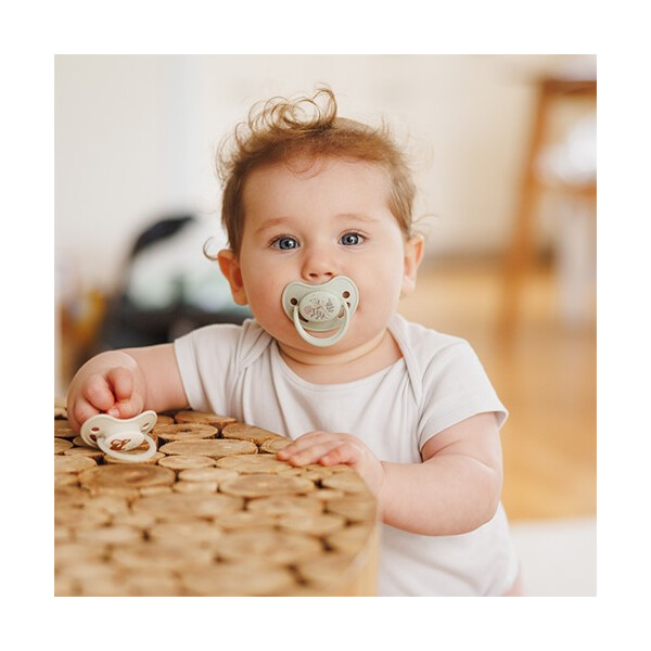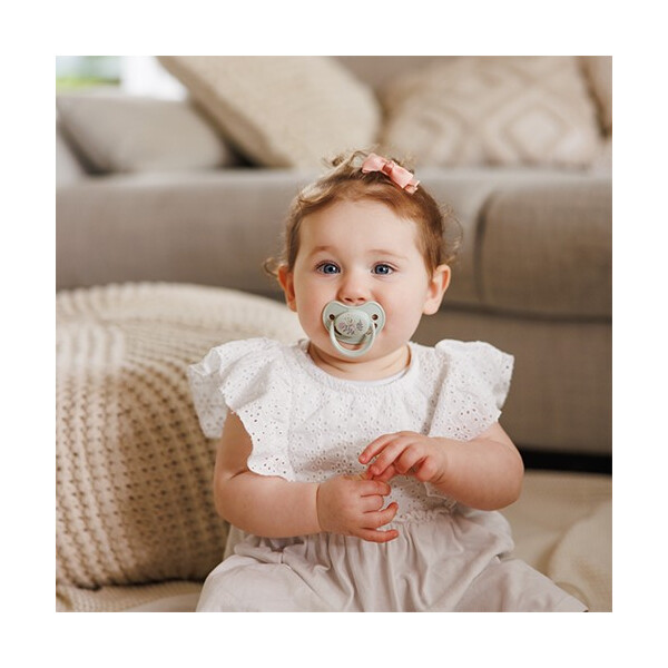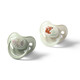 Το σετ περιλαμβάνει δύο πιπίλες – μία για την ημέρα και μία με φωσφορίζουσα λαβή για τη νύχτα. Η θηλή είναι κατασκευασμένη από υποαλλεργική σιλικόνη, χωρίς BPA και ανθεκτική στη φθορά.