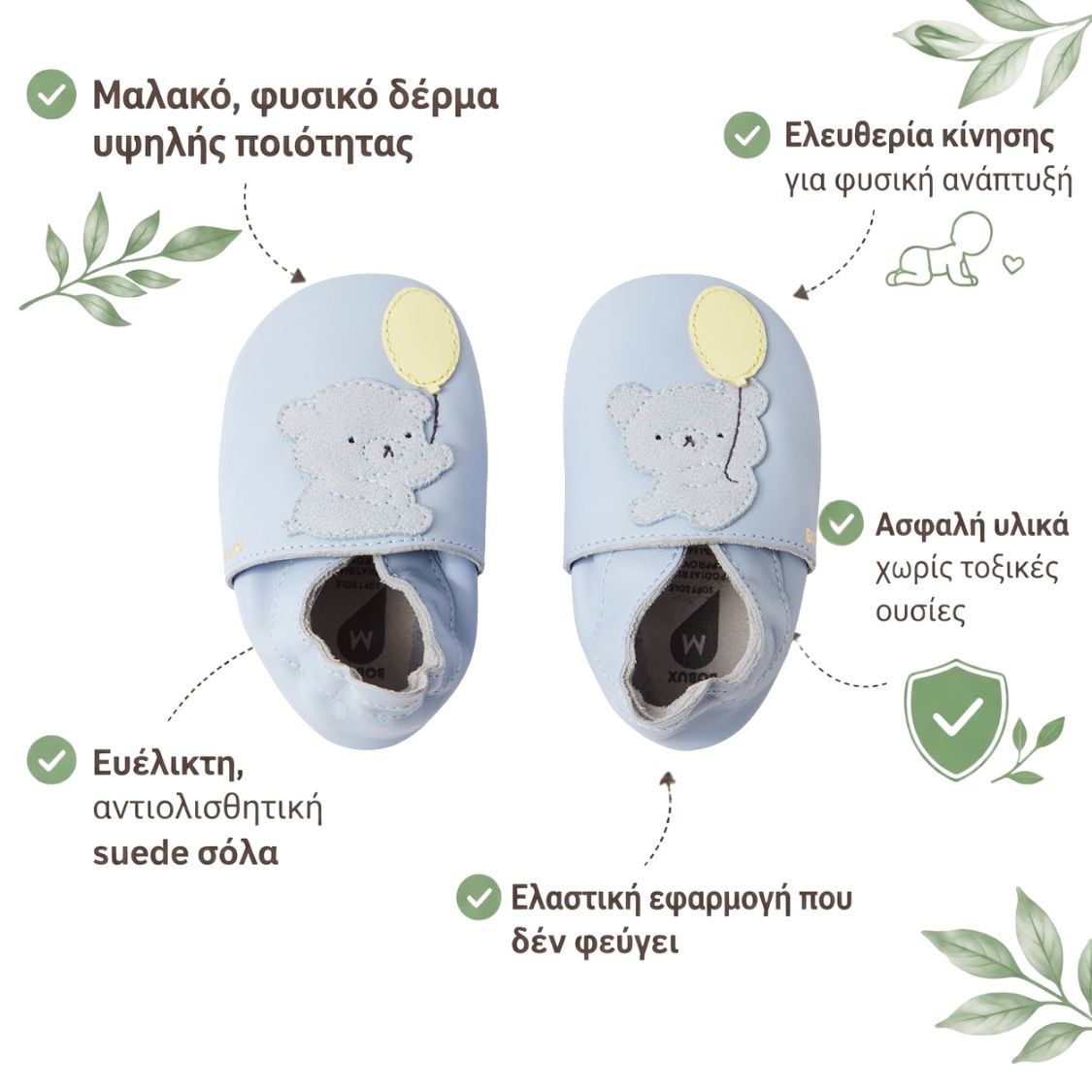 Τα ποδαράκια των νεογέννητων είναι τόσο μαλακά που τα άκαμπτα παπούτσια ή ακόμα και οι σφιχτές κάλτσες μπορεί να επηρεάσουν την υγιή ανάπτυξή τους. Τα Soft Soles της Bobux είναι κατασκευασμένα από εύκαμπτο δέρμα που προστατεύει τα μικρά ποδαράκια και ταυτόχρονα προσφέρουν την ελευθερία να αναπτυχθούν φυσικά. Διαθέτουν μαλακή σόλα από σουέντ, αδιάβροχο δερμάτινο άνω μέρος και ελαστικό αστράγαλο που εμποδίζει τα ποδαράκια να τα βγάλουν από το κλώτσημα.