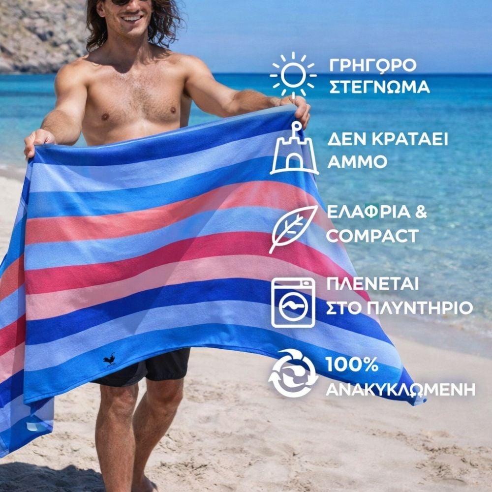 A: Ναι, η πετσέτα είναι σχεδιασμένη να μην κρατάει την άμμο, καθιστώντας τον καθαρισμό της πολύ εύκολο. Επιπλέον, στεγνώνει 3 φορές πιο γρήγορα από τις κοινές πετσέτες και διπλώνει σε ένα μικρό πουγκάκι (26x15εκ.), ώστε να μην έχετε υγρά και ογκώδη πράγματα στην τσάντα σας.