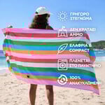 A: Ναι, η πετσέτα είναι σχεδιασμένη να μην κρατάει άμμο, κάτι που την καθιστά ιδανική για την παραλία. Όσον αφορά το μέγεθος, η Large (160x80cm) διπλώνει σε πουγκί 26x15cm και η Extra Large (200x90cm) σε πουγκί 30x16cm, κάνοντάς τη συμπαγή και πανάλαφρη για εύκολη μεταφορά.