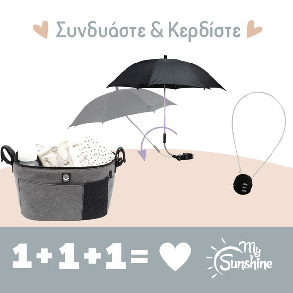 Μια ομπρέλα με UV50+, απαραίτητη για την προστασία του παιδιού από τον ήλιο, ένα υπέροχο organizer (που κρεμμιέται από το καρότσι) για να έχετε εύκολη και γρήγορη πρόσβαση στα πράγματα που χρησιμοποιείται συχνά στην βόλτα σας και φυσικά ένα λουκέτο, για να ασφαλίζετε το αγαπημένο σας καρότσι αν χρειαστεί να το αφήσετε κάπου για λίγο .... μόνο του!