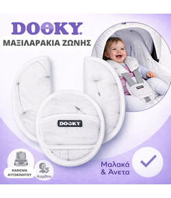 Το κάλυμμα καθίσματος αυτοκινήτου Dooky αποτελείται από δύο μέρη. Ένα μέρος γύρω από το κάθισμα και ένα μέρος γύρω από το προσκέφαλο. Ως αποτέλεσμα, το προσκέφαλο μπορεί ακόμα να ρυθμιστεί εύκολα και το σφίξιμο των ιμάντων δεν αποτελεί πρόβλημα και με τα δύο καθίσματα όταν το κάλυμμα είναι γύρω του.