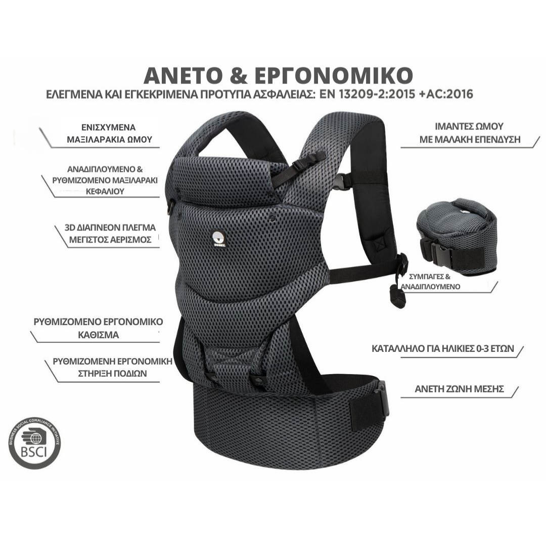 Όποιο τρόπο και αν διαλέξετε, με το στιβαρό υλικό του και τις επιλογές ρύθμισης των ιμάντων και της θέσης κεφαλιού, θα είστε πάντα σίγουροι ότι το μωρό στηρίζεται πάνω σας με ασφάλεια και άνεση, ενώ ο δικός σας κορμός δε κινδυνεύει από μυϊκούς τραυματισμούς και καταπόνηση.
