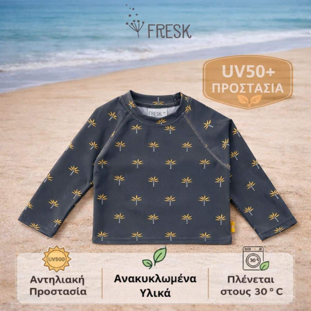 Με την μακρυμάνικη μπλούζα-μαγιό της Fresk, το μικρό σου μπορεί να παίζει άνετα στη θάλασσα ή την πισίνα, χωρίς να σε αγχώνει ο ήλιος.