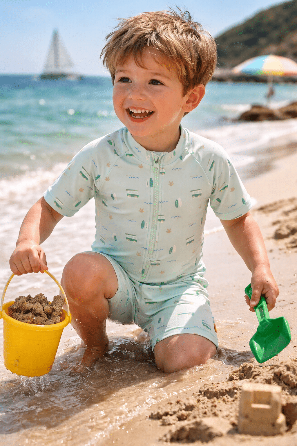 Η UV προστασία 50+ φροντίζει το ευαίσθητο δερματάκι του, για να παίζει με ασφάλεια κάτω από τον ήλιο. Το ύφασμα είναι απαλό, ελαφρύ και αγκαλιάζει το σώμα του με άνεση, χωρίς να το ενοχλεί στις κινήσεις του.