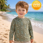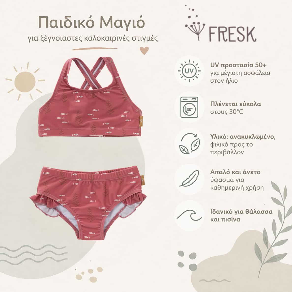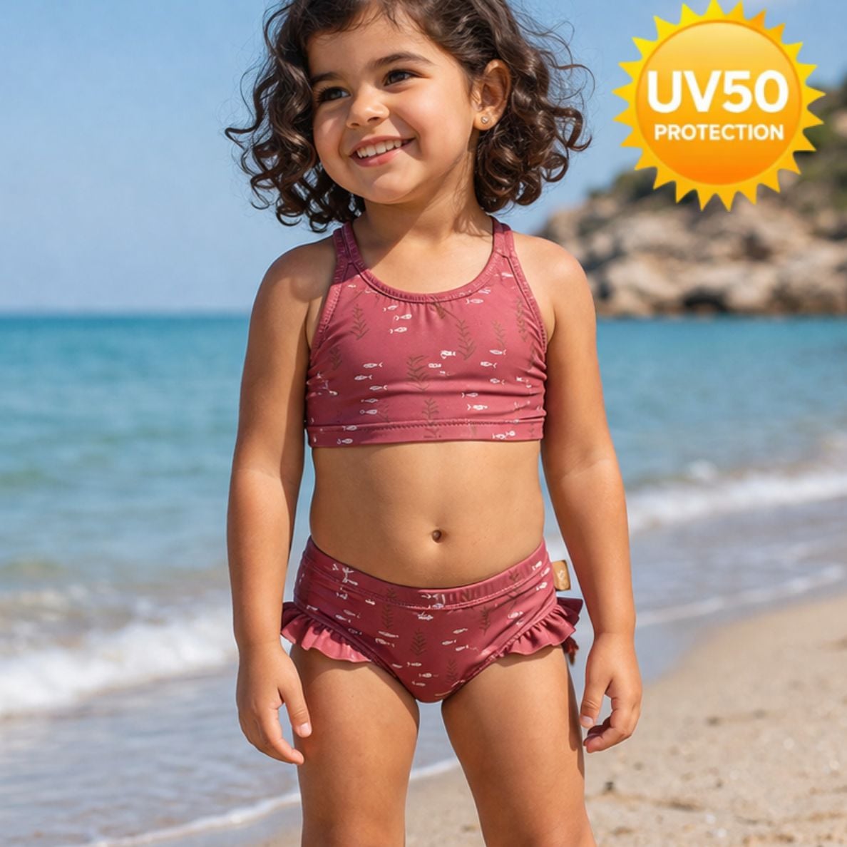 A: Το σετ μπικίνι προσφέρει UV προστασία 50+, που σημαίνει ότι προστατεύει αποτελεσματικά το ευαίσθητο δερματάκι του παιδιού από τον ήλιο στις περιοχές που καλύπτει το ύφασμα.