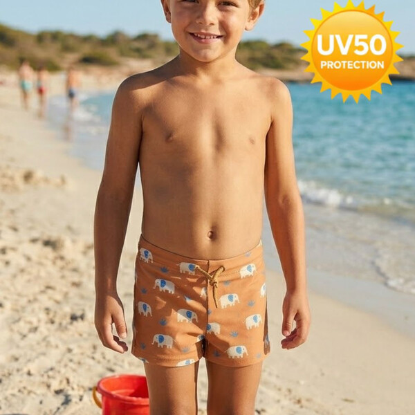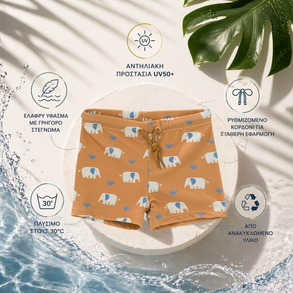 Η αντηλιακή προστασία UV50+ βοηθά στην προστασία της ευαίσθητης παιδικής επιδερμίδας από την ηλιακή ακτινοβολία, ενώ το ύφασμα στεγνώνει γρήγορα ώστε να παραμένει άνετο μετά το μπάνιο.
