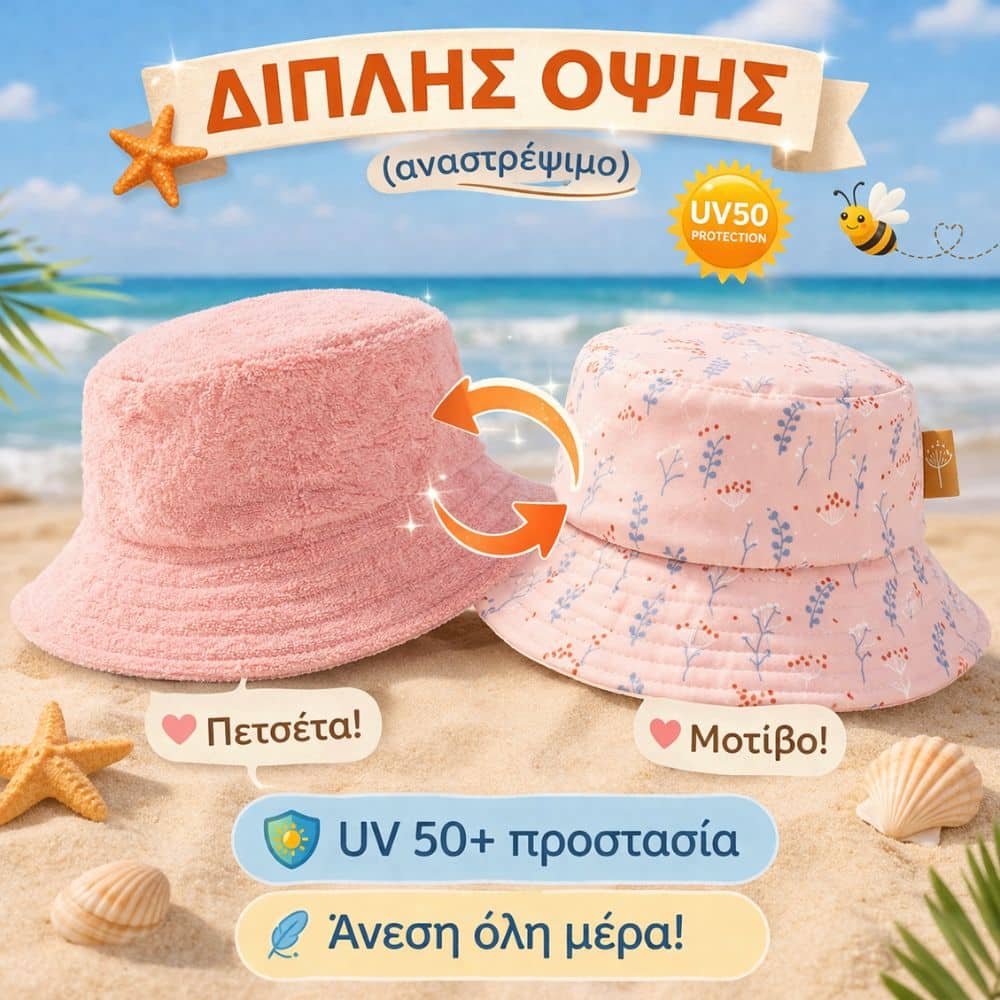 Καπέλα διπλής όψης: Για τα παιδιά που αγαπούν τη ποικιλία και το στυλ! Αλλάξτε εμφάνιση σε δευτερόλεπτα, απλά αναστρέφοντας το καπέλο. Με γείσο και προστασία UV 50+, είναι η τέλεια επιλογή για κάθε καλοκαιρινή βόλτα, προσφέροντας και στυλ και προστασία.