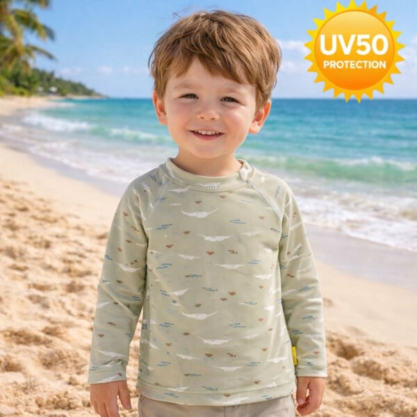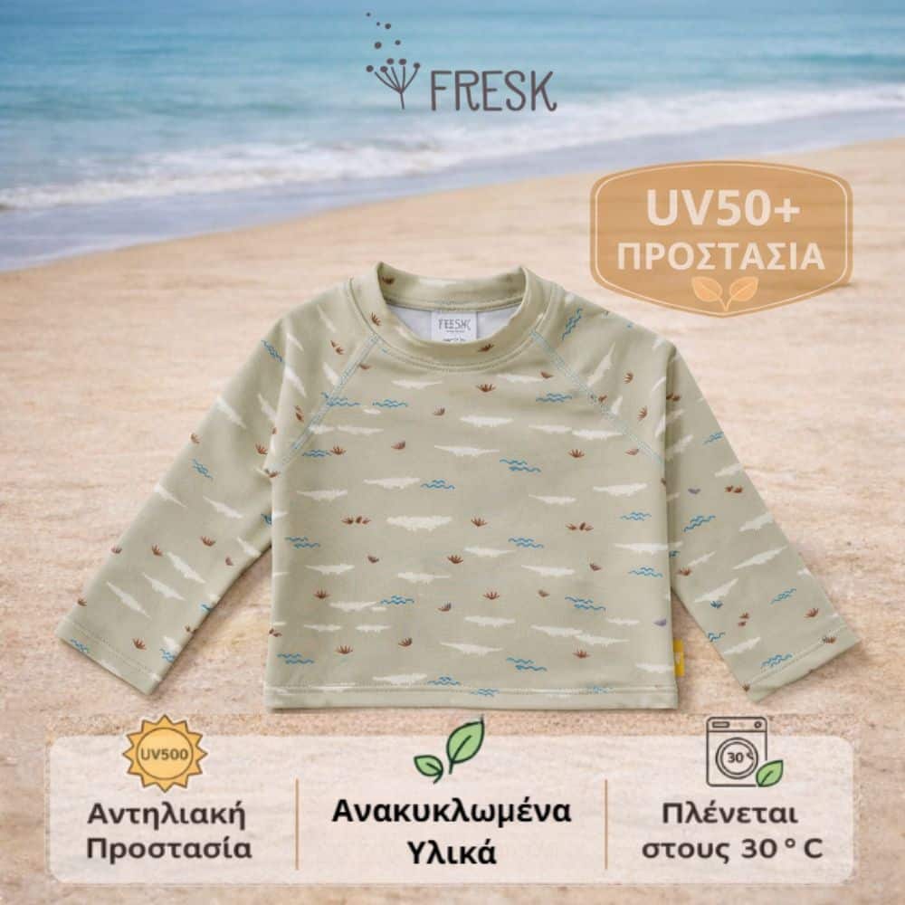 Με την μακρυμάνικη μπλούζα-μαγιό της Fresk, το μικρό σου μπορεί να παίζει άνετα στη θάλασσα ή την πισίνα, χωρίς να σε αγχώνει ο ήλιος.