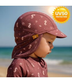 A: Το καπέλο προσφέρει UV Προστασία 50+ και έχει γείσο γύρω γύρω που καλύπτει τα ματάκια, το πρόσωπο, τα αυτιά και τον λαιμό, εξασφαλίζοντας πλήρη κάλυψη ακόμα και κατά τη διάρκεια του παιχνιδιού.