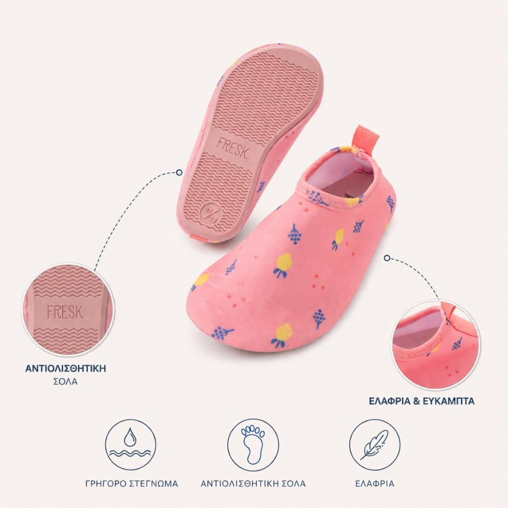 Στην παραλία, στην πισίνα ή στο κάμπινγκ, τα σωστά παπουτσάκια κάνουν τη διαφορά. Τα Fresk είναι σχεδιασμένα για άνεση, ασφάλεια και στυλ – ώστε τα παιδιά να μπορούν να κινούνται ελεύθερα, χωρίς να τα ενοχλεί τίποτα.