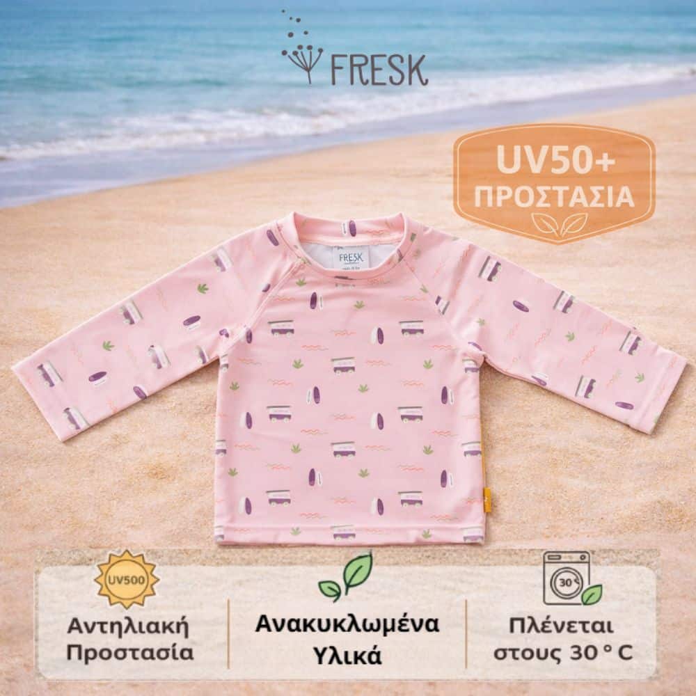 Με την μακρυμάνικη μπλούζα-μαγιό της Fresk, το μικρό σου μπορεί να παίζει άνετα στη θάλασσα ή την πισίνα, χωρίς να σε αγχώνει ο ήλιος.