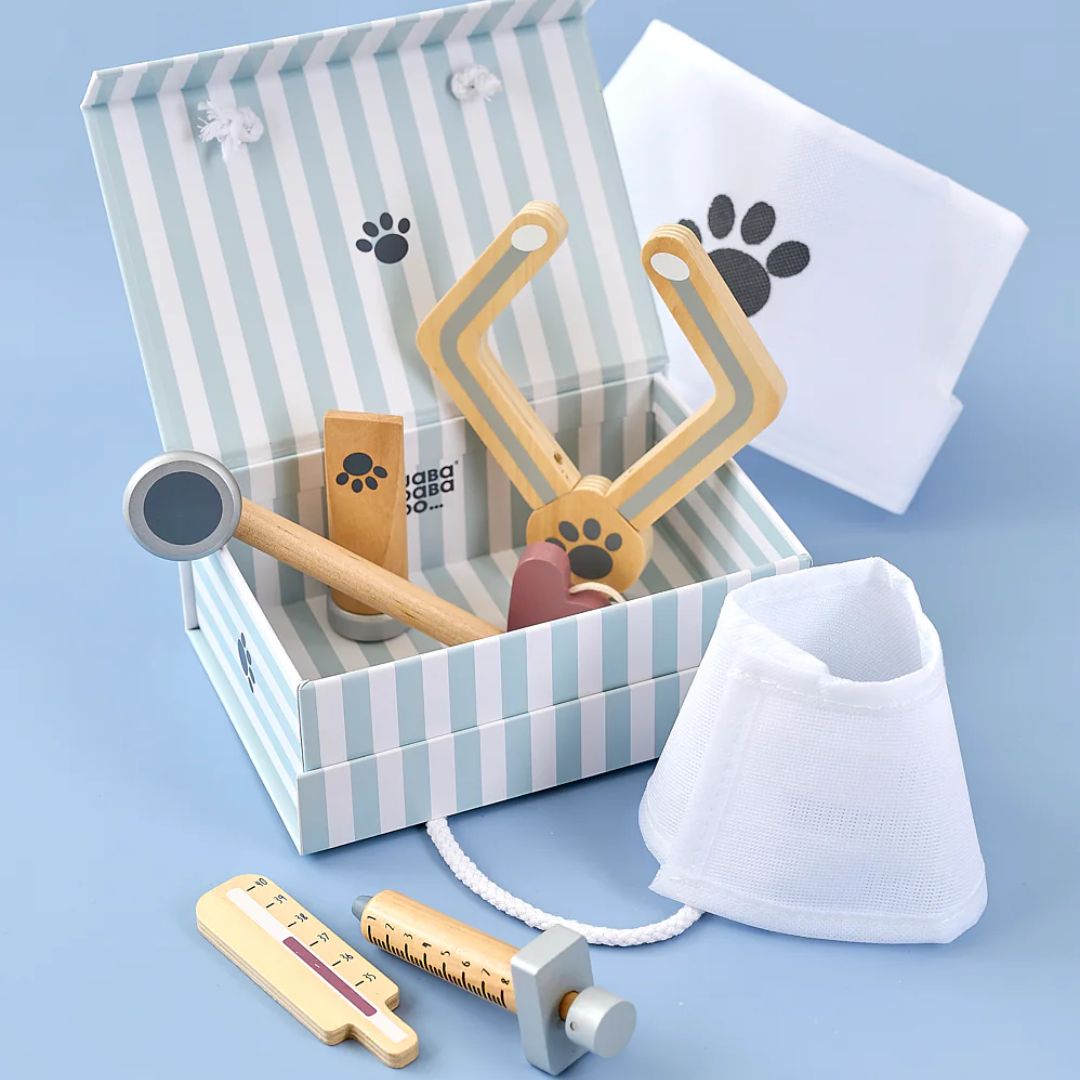 Αυτό το πλήρως εξοπλισμένο κτηνιατρικό βαλιτσάκι με μαγνητικό κλείσιμο από την Jabadabado διαθέτει όλα τα κατάλληλα ξύλινα εργαλεία για να σώσετε τα αγαπημένα σας ζωάκια και τα λούτρινα κουκλάκια που έχουν ανάγκη.