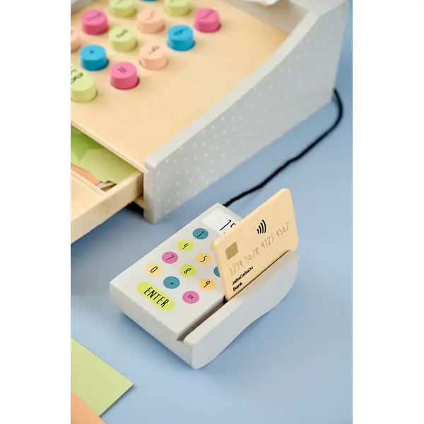 Το ταμείο διαθέτει συρταράκι για τα χρήματα, scanner για τα προϊόντα, μηχάνημα για πιστωτική κάρτα και οθόνη για να φαίνεται η αξία των αγορών.