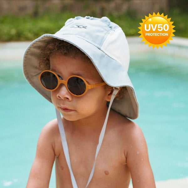A: Το καπέλο προσφέρει φυσική αντηλιακή προστασία UPF50+, που σημαίνει ότι μπλοκάρει πάνω από το 98% των ακτίνων UV. Επιπλέον, διαθέτει μακρύτερο πίσω μέρος ειδικά σχεδιασμένο για να προστατεύει τους μικρούς λαιμούς.