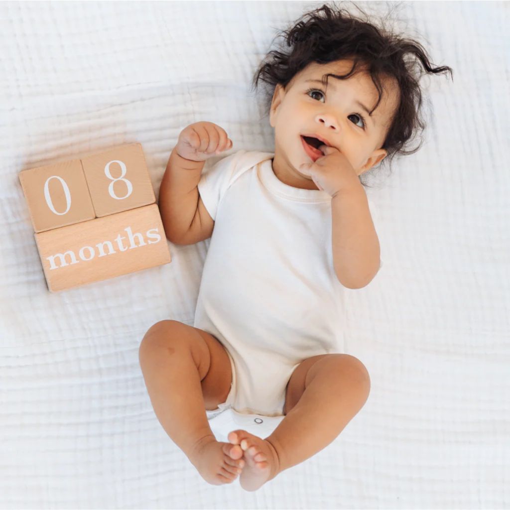 Το σετ περιλαμβάνει αριθμημένα κυβάκια και βάση με “week/weeks” και “month/months”, ώστε να μπορείς εύκολα να δείξεις την ανάπτυξη του μωρού ή την πρόοδο της εγκυμοσύνης σου με έναν καθαρό και κομψό τρόπο.