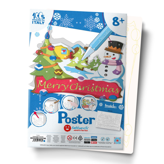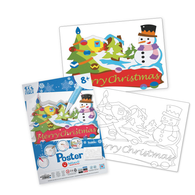 Το μεγάλο πόστερ 26x40 cm σε αυτοκόλλητο χαρτί απεικονίζει ένα μαγικό χιονισμένο τοπίο. Μόλις αφαιρέσετε τα κομμάτια του σχεδίου, η επιφάνεια είναι έτοιμη για χρωματισμό με άμμο Sabbiarelli®.