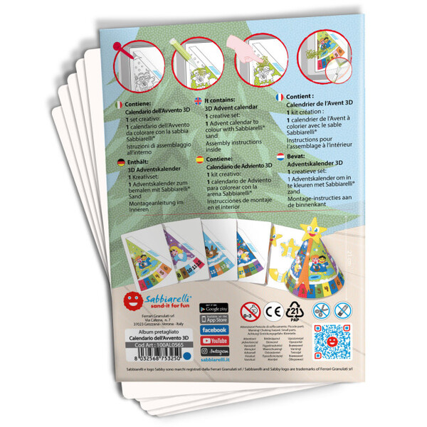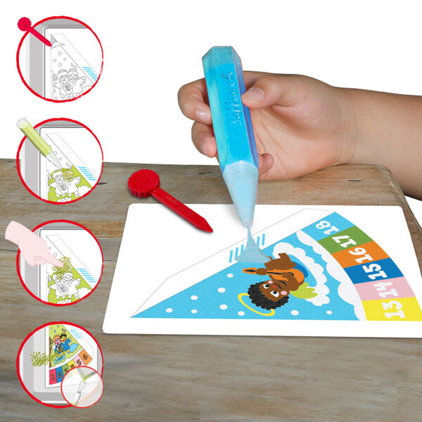 Δεν χρειάζεται ψαλίδι ή κόλλα: αφαιρώντας το χαρτί από το σχέδιο, η επιφάνεια κόλλας παραμένει για να χρωματιστεί με άμμο Sabbiarelli®.