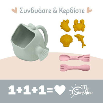 Το σετ περιλαμβάνει 4 καλούπια: πατουσάκι, δελφινάκι, καβουράκι, κοχύλι και έρχεται μέσα σε μία εύχρηστη τσαντούλα από δίχτυ, ιδανική για την άμμο και τη θάλασσα!