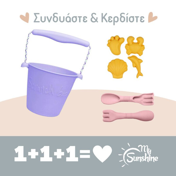 Προσφορά Scrunch: Κουβαδάκι + Φτυαράκι - Τσουγκράνα + Καλούπια (4 τεμάχια), όλα από ανακυκλώσιμη σιλικόνη