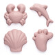 Το σετ περιλαμβάνει 4 καλούπια: πατουσάκι, δελφινάκι, καβουράκι, κοχύλι και έρχεται μέσα σε μία εύχρηστη τσαντούλα από δίχτυ, ιδανική για την άμμο και τη θάλασσα!