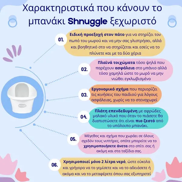 Αν ψάχνετε έναν τρόπο να κάνετε το πρώτο μπανάκι του μωρού εύκολο, ασφαλές και απολαυστικό, τότε το Shnuggle είναι αυτό ακριβώς που χρειάζεστε. Βραβευμένο, αγαπημένο και πραγματικά απαραίτητο, το μπανάκι-φαινόμενο που έχει κατακτήσει τις καρδιές νέων γονιών.
