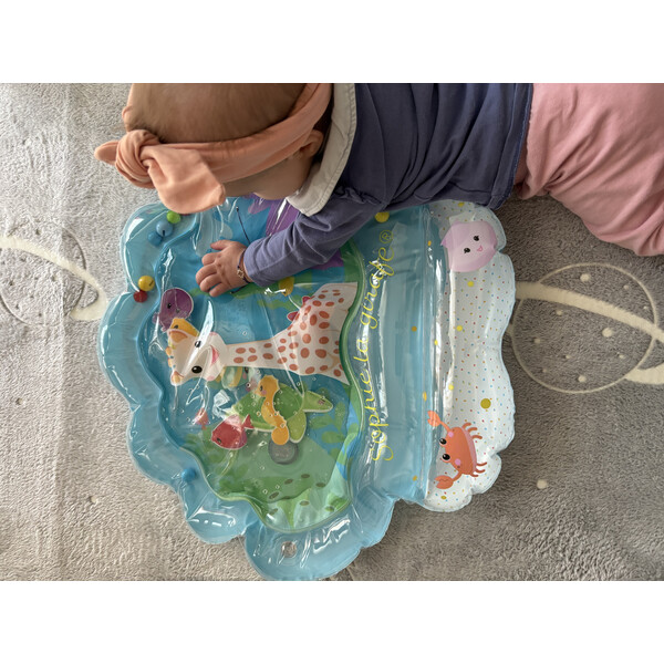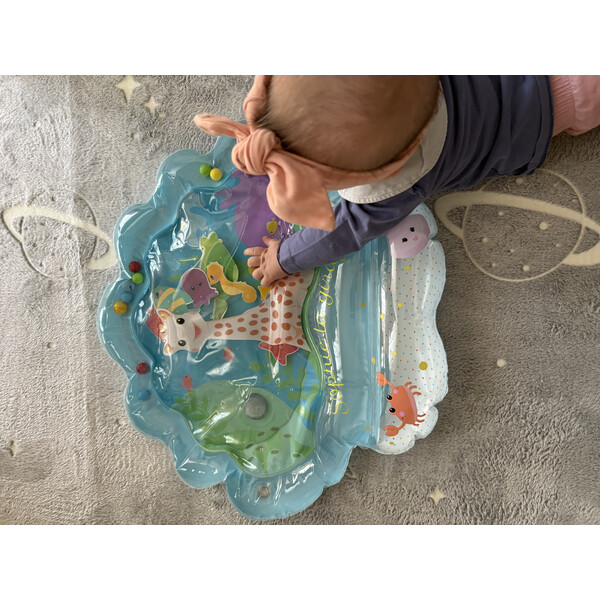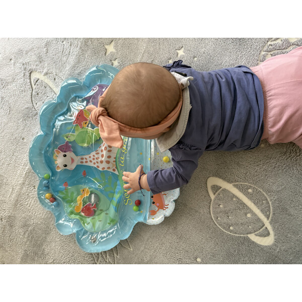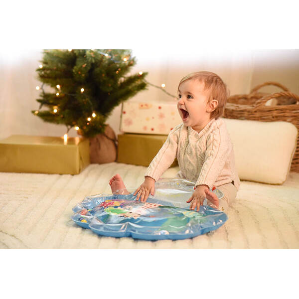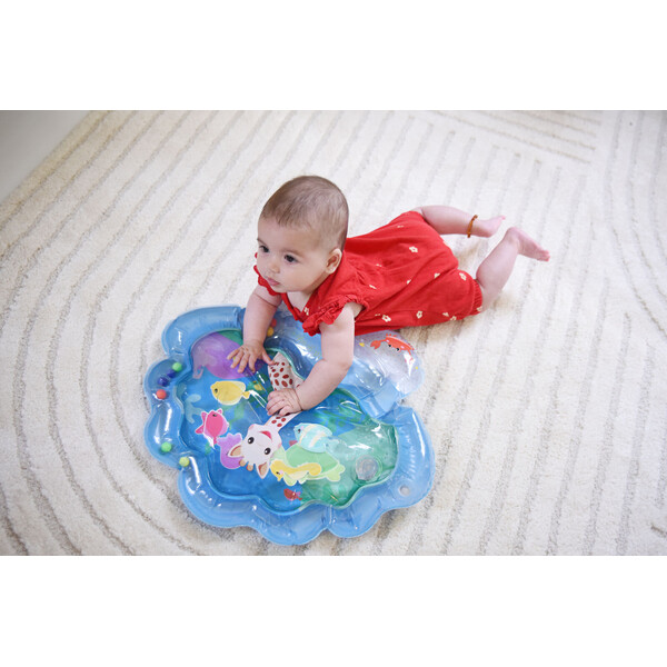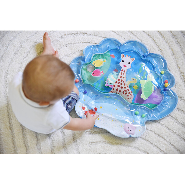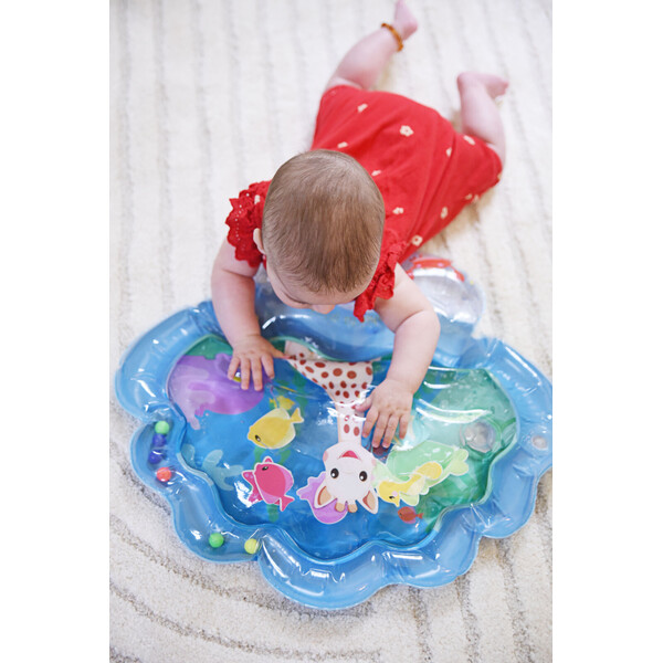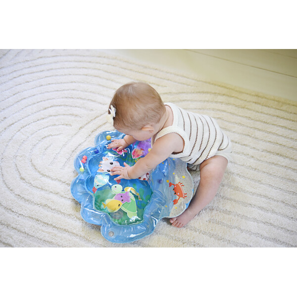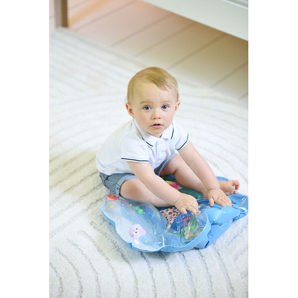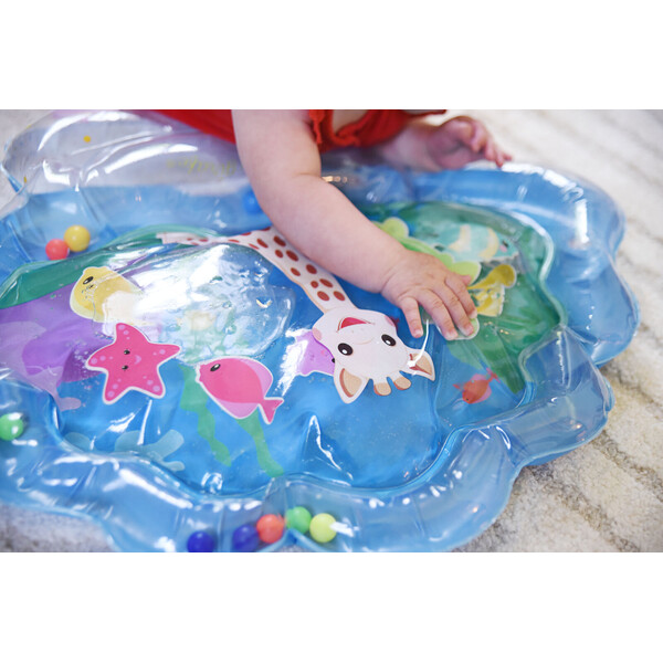Όταν το μωρό πιέζει το κέντρο του στρώματος, το νερό κινείται και τα 7 επιπλέοντα ζωάκια μετακινούνται με τα “ρεύματα”. Έτσι το παιδί ανακαλύπτει αιτία-αποτέλεσμα και πειραματίζεται με την αφή.