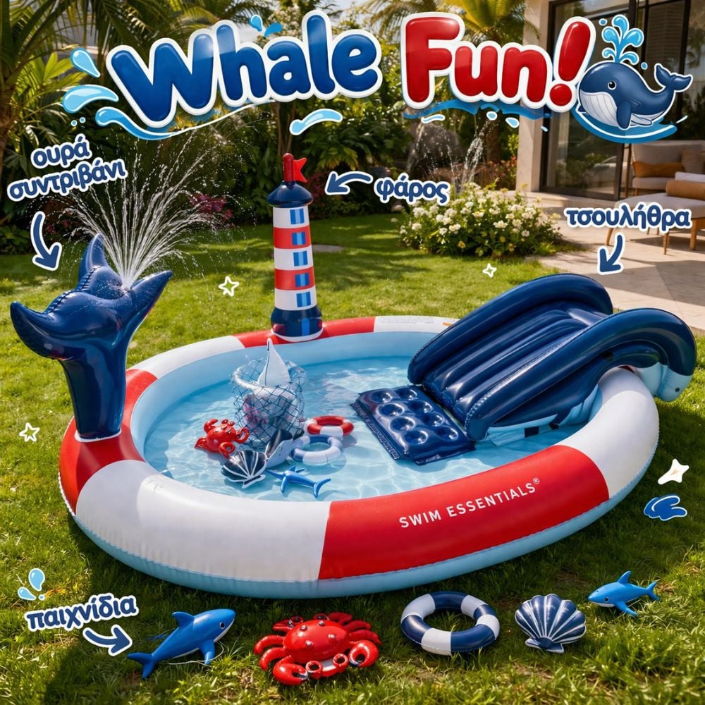 Η τσουλήθρα χαρίζει ασταμάτητη δράση, ενώ η ουρά της φάλαινας δημιουργεί μια απολαυστική εμπειρία παιχνιδιού, καθώς πετάει νερό και μετατρέπεται σε συντριβάνι