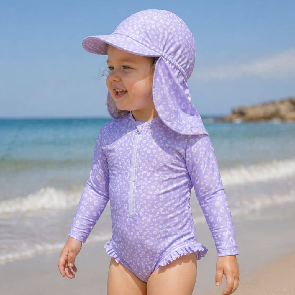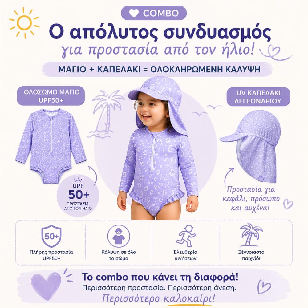 A: Τόσο το ολόσωμο μαγιό όσο και το καπέλο προσφέρουν προστασία UPF50+, η οποία μπλοκάρει αποτελεσματικά τις βλαβερές ακτίνες του ήλιου. Το καπέλο, ειδικά, έχει σχεδιασμό τύπου λεγεωνάριου για μέγιστη κάλυψη στον σβέρκο και τα αφτιά, ιδανικό για πολύωρη παραμονή.