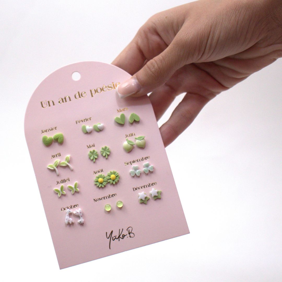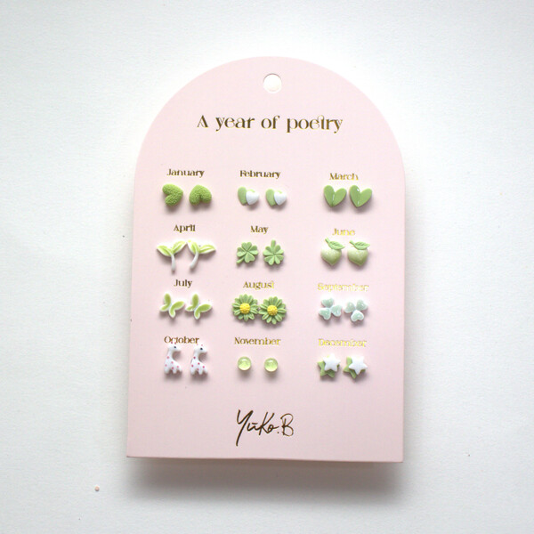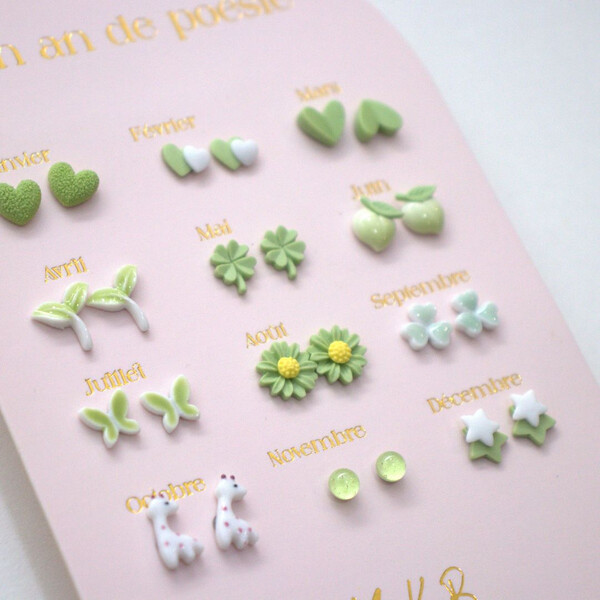 Μια όμορφη καρτέλα με 12 ζευγάρια σκουλαρίκια, ένα ζευγάρι για κάθε μήνα του χρόνου.