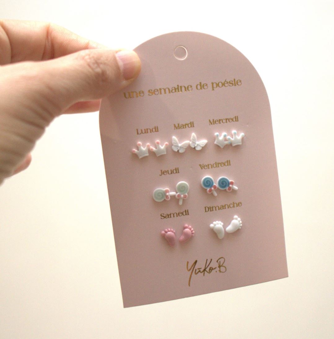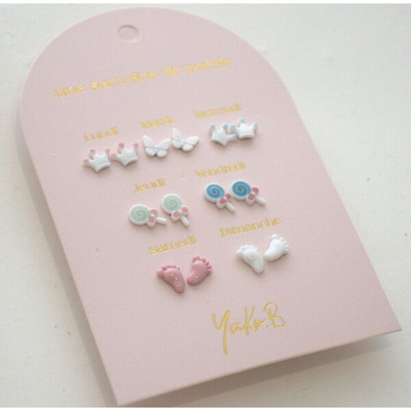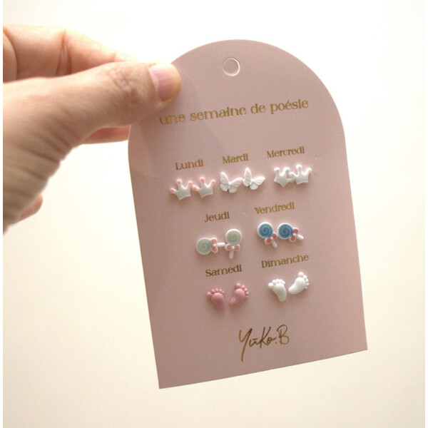 Μια όμορφη καρτέλα με 7 ζευγάρια σκουλαρίκια. Κάθε ζευγάρι είναι διακοσμημένο με ένα μοτίβο.