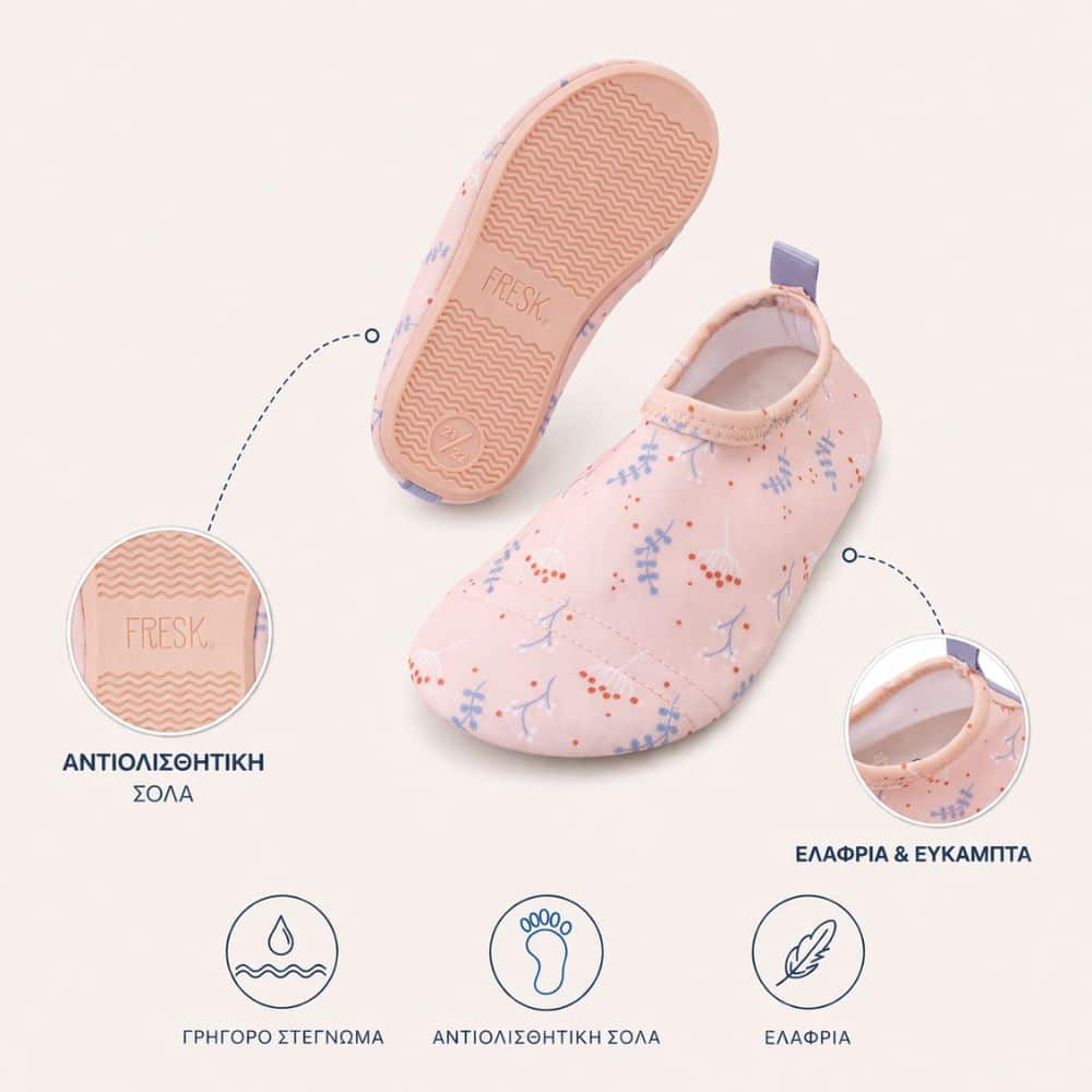 Στην παραλία, στην πισίνα ή στο κάμπινγκ, τα σωστά παπουτσάκια κάνουν τη διαφορά. Τα Fresk είναι σχεδιασμένα για άνεση, ασφάλεια και στυλ – ώστε τα παιδιά να μπορούν να κινούνται ελεύθερα, χωρίς να τα ενοχλεί τίποτα.