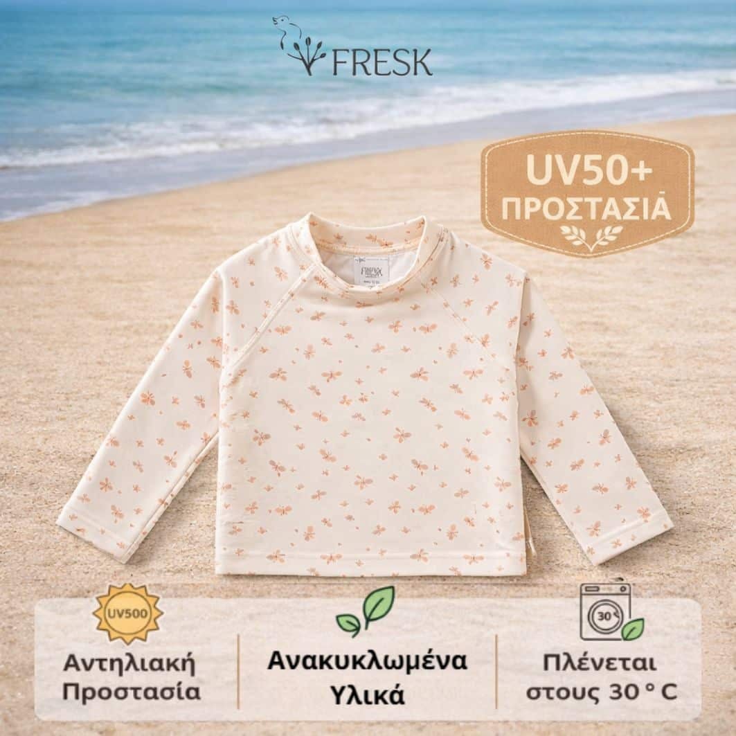 Με την μακρυμάνικη μπλούζα-μαγιό της Fresk, το μικρό σου μπορεί να παίζει άνετα στη θάλασσα ή την πισίνα, χωρίς να σε αγχώνει ο ήλιος.