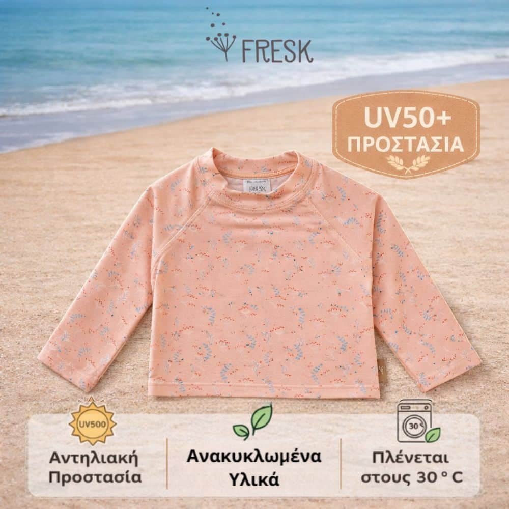 Με την μακρυμάνικη μπλούζα-μαγιό της Fresk, το μικρό σου μπορεί να παίζει άνετα στη θάλασσα ή την πισίνα, χωρίς να σε αγχώνει ο ήλιος.