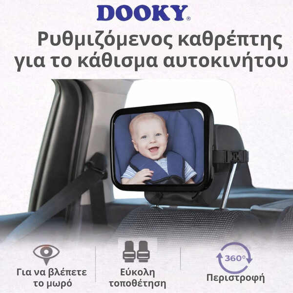 Ο ρυθμιζόμενος καθρέφτης DOOKY είναι η λύση στην αναζήτησή μας και μπορούμε πλέον να έχουμε οπτική επαφή με το μωρό μας χωρίς να αναγκαζόμαστε να γυρίζουμε κατά την οδήγηση.