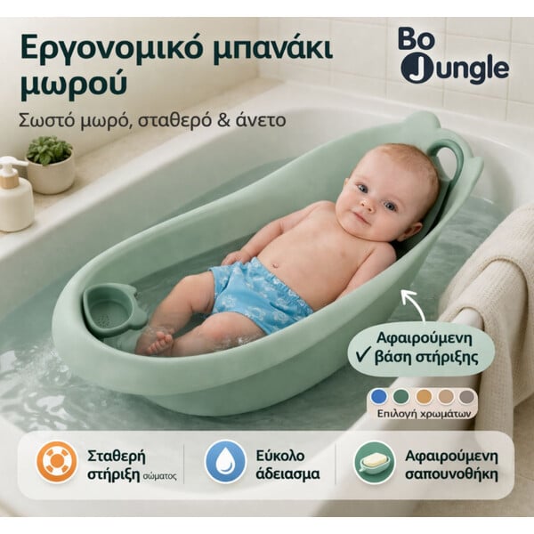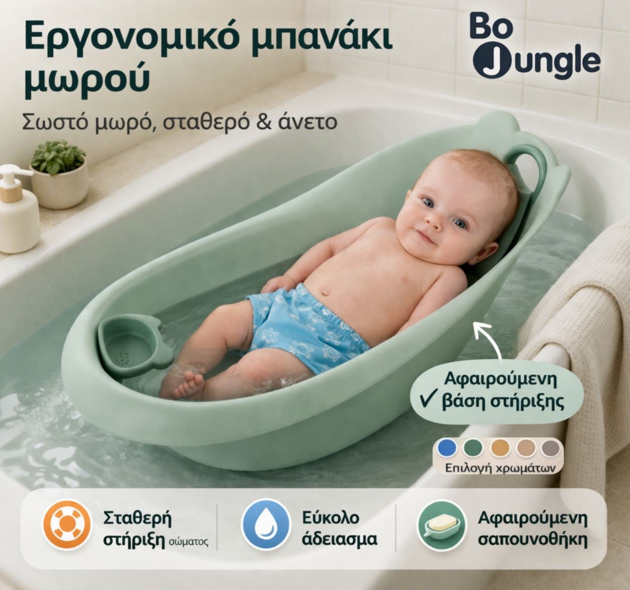 Με το εργονομικό μπανάκι της Bo Jungle, το μπάνιο γίνεται εύκολο για εσένα και απολαυστικό για το μωρό σου — από την πρώτη κιόλας μέρα.