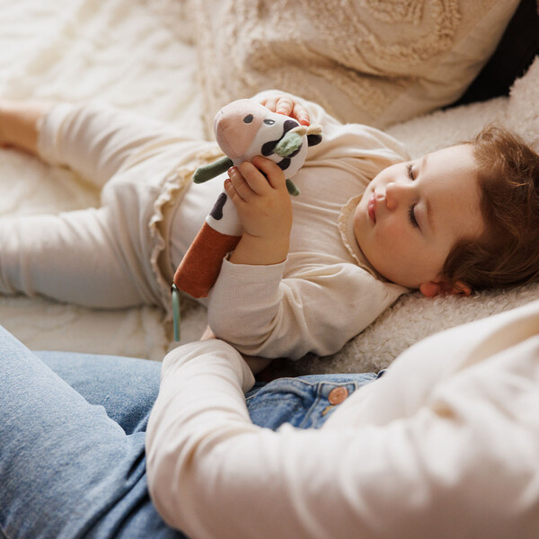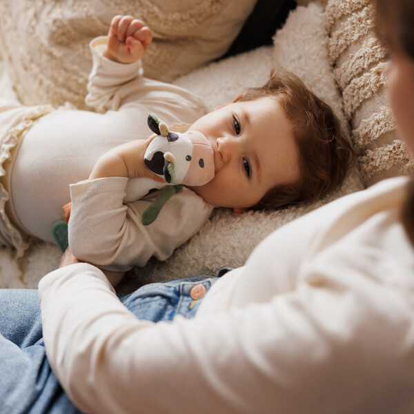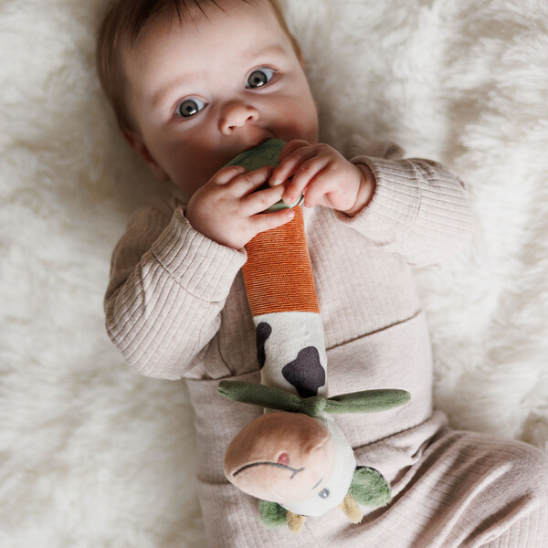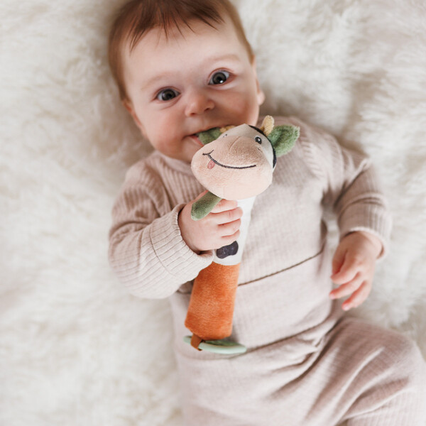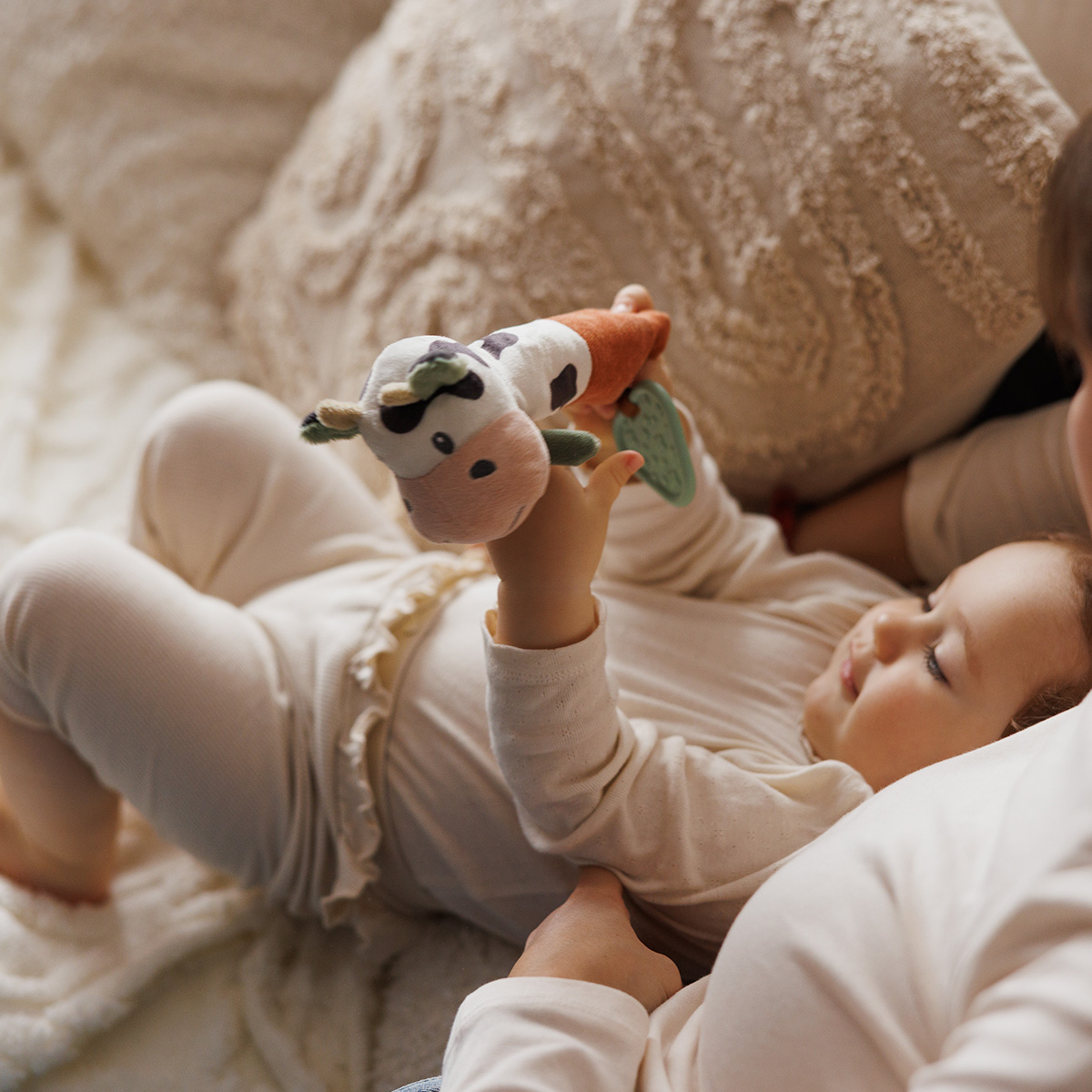 Ένα λούτρινο squeaker με πολύχρωμες ετικέτες για να εξερευνά με τα χεράκια του, μαζί με ένα μασητικό που το ανακουφίζει στη δύσκολη περίοδο της οδοντοφυΐας.