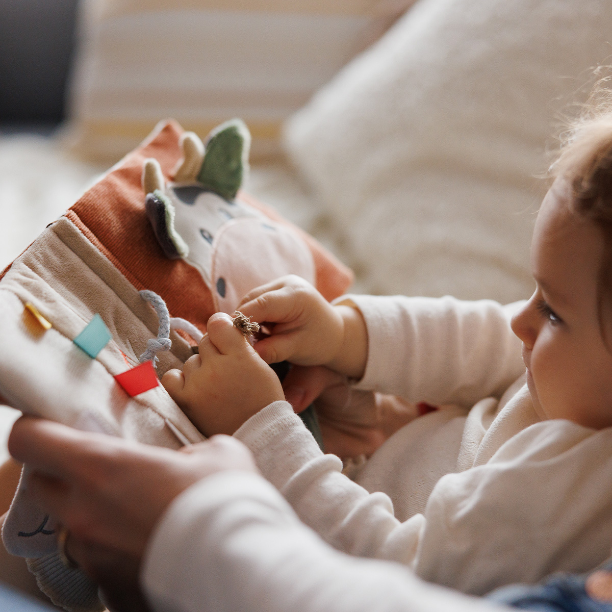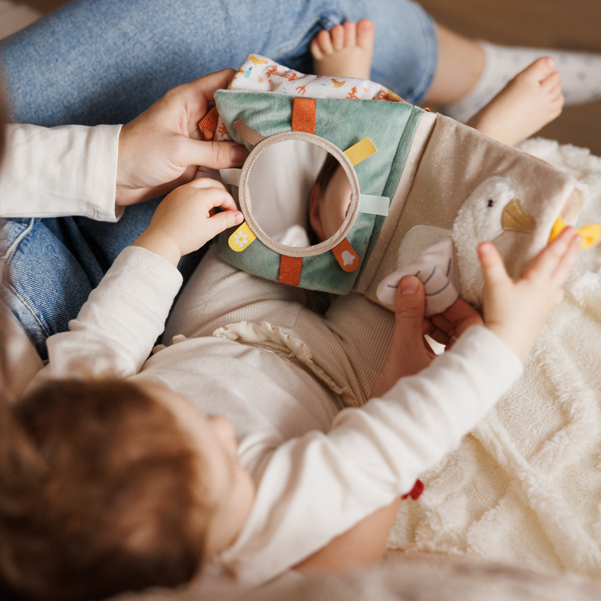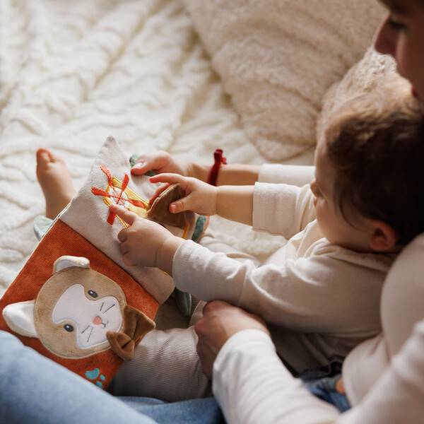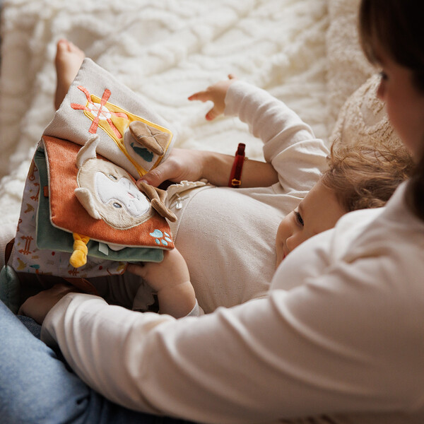 Διάφορες υφές, σχήματα, κουδουνίστρες, καθρεφτάκι και πολύχρωμες κορδέλες κρατούν το μωρό απασχολημένο και ενθαρρύνουν την εξερεύνηση και τη φαντασία.
