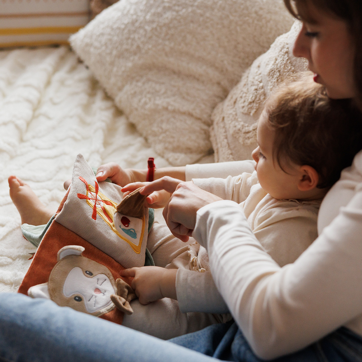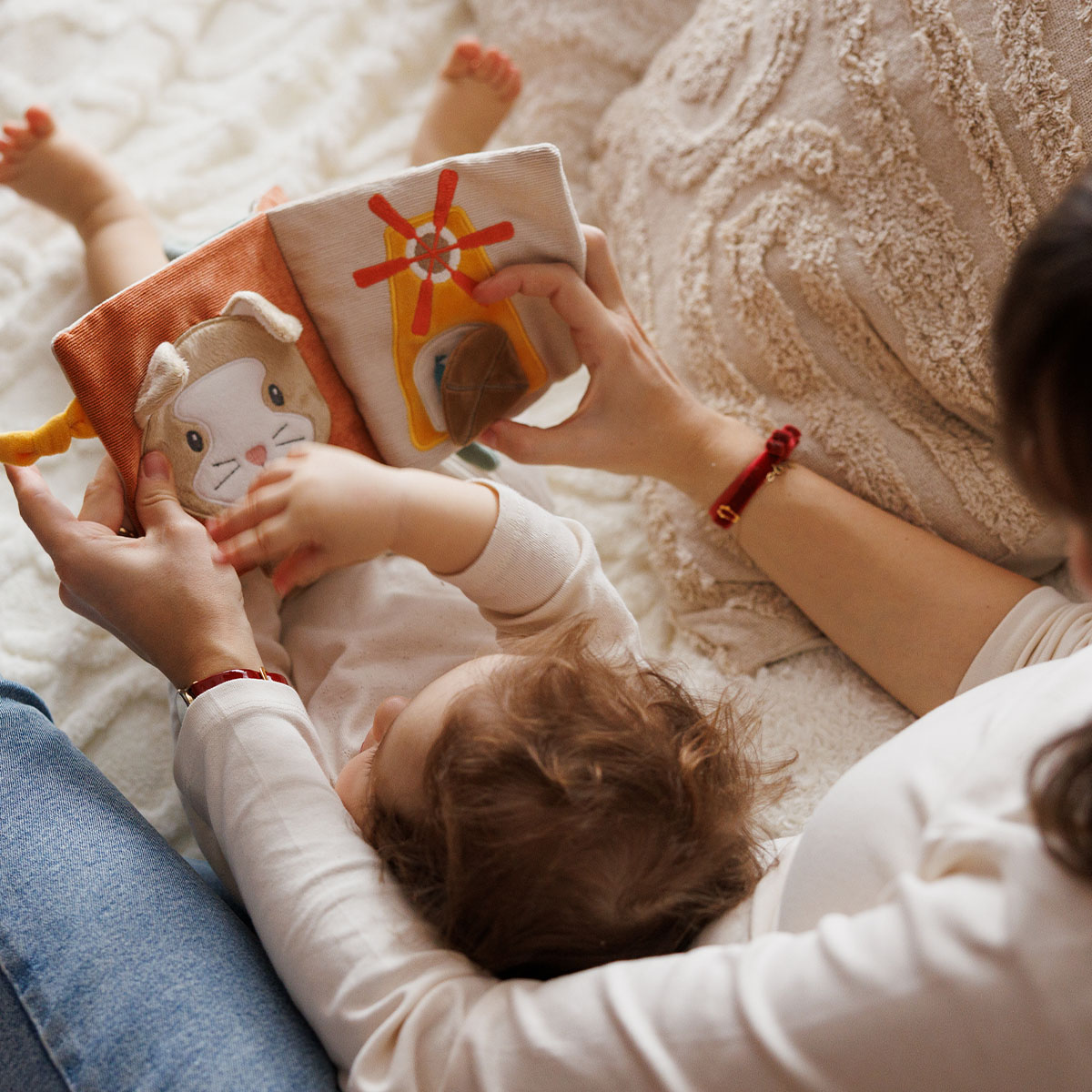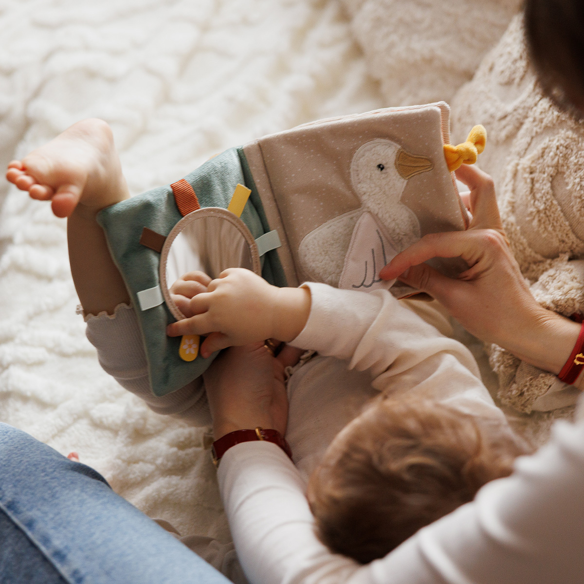 Διάφορες υφές, σχήματα, κουδουνίστρες, καθρεφτάκι και πολύχρωμες κορδέλες κρατούν το μωρό απασχολημένο και ενθαρρύνουν την εξερεύνηση και τη φαντασία.