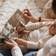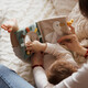 Στοιχεία παιχνιδιού: καθρεφτάκι, κουδουνίστρα, στοιχεία με ήχους, κορδέλες και κόμποι