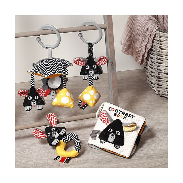 Ο συνδυασμός μαύρου & λευκού με κόκκινες και κίτρινες λεπτομέρειες είναι ιδανικός για τα πρώτα στάδια όρασης του μωρού, βοηθώντας: