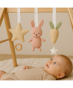 - Τα κρεμαστά ζωάκια προσελκύουν την προσοχή του, αναπτύσσοντας έτσι την αίσθηση της όρασης.