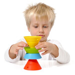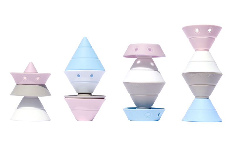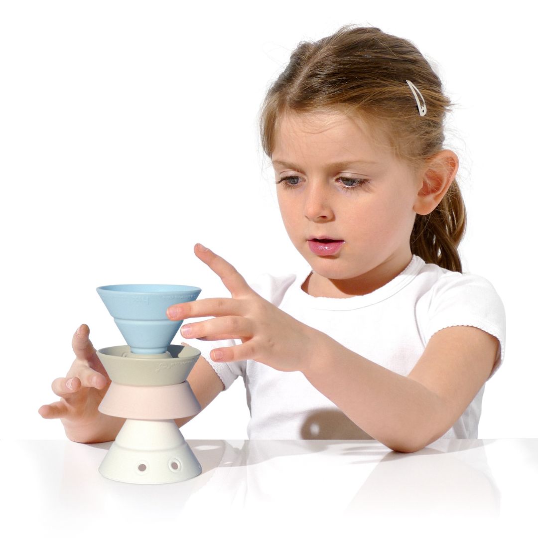 Κατασκευασμένο από μαλακή και ανθεκτική σιλικόνη, κάθε ένα από τα τέσσερα πολύχρωμα κωνικά κομμάτια μπορεί να διπλωθεί και να αναστραφεί σε τέσσερα διαφορετικά σχήματα, προσφέροντας ατελείωτες δυνατότητες στοίβαξης, φωλιάσματος, ισορροπίας και κατασκευής.