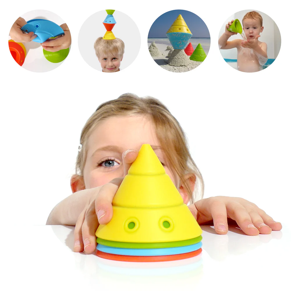 Κατασκευασμένο από μαλακή και ανθεκτική σιλικόνη, κάθε ένα από τα τέσσερα πολύχρωμα κωνικά κομμάτια μπορεί να διπλωθεί και να αναστραφεί σε τέσσερα διαφορετικά σχήματα, προσφέροντας ατελείωτες δυνατότητες στοίβαξης, φωλιάσματος, ισορροπίας και κατασκευής.
